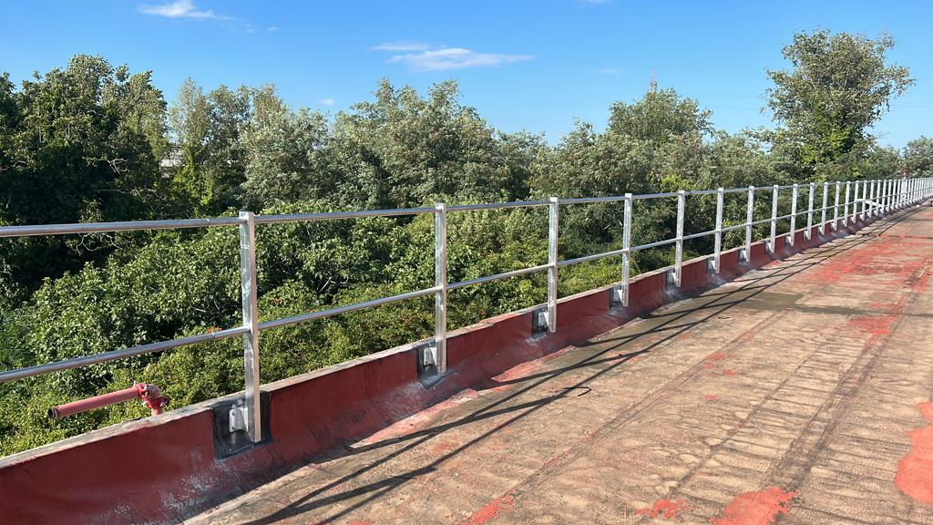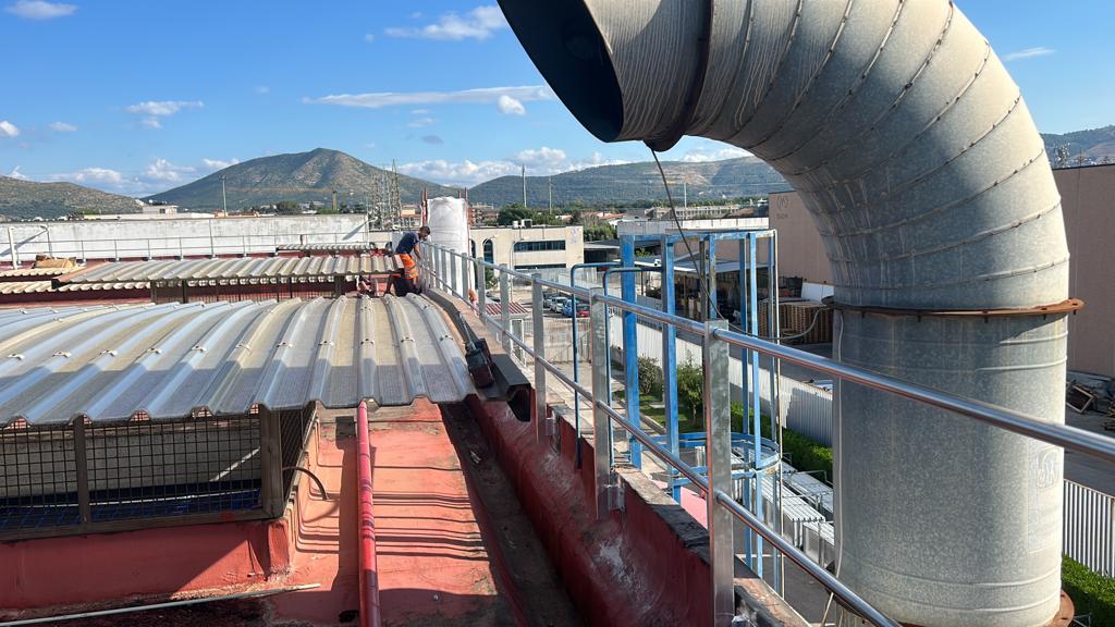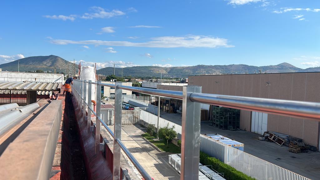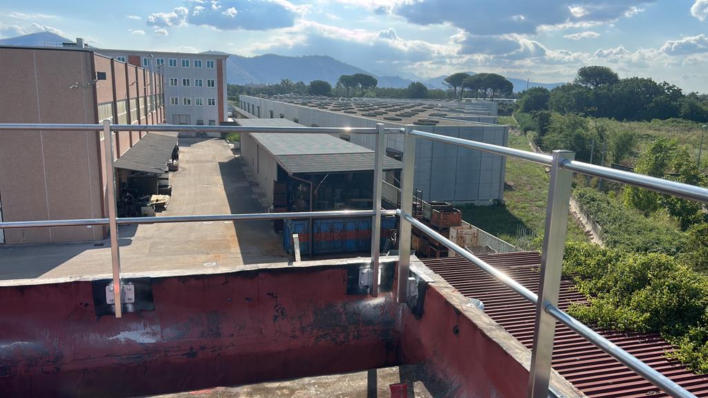 Montaggio parapetto presso Manini prefabbricati. L’ancoraggio è stato effettuato tramite piastre di collegamento, al muro perimetrale.